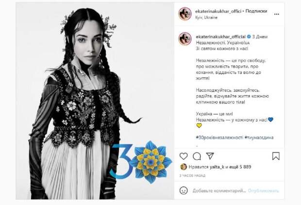 Екатерина Кухар из "Танців з зірками" показали эффектные образы, поздравив украинцев Как пишет Politeka.net, Екатерина Кухар решила не отставать от звезд украинского шоу-биза и поздравила украинцев с Днем Независимости. "С Днем Независимости, Украина! С праздником каждого из нас! Независимость - это о свободе, о возможности творить, о любви, преданность и волю к жизни!