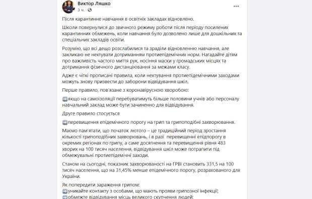 Украинские школьники вернулись в школы и должны помнить главные противоэпидемические правила В Украине с 25 января возобновились занятия в школах, и дети снова вернулись в коллективы. Главный санитарный врач Виктор Ляшко призвал украинцев в Facebook соблюдать важные противоэпидемические правила, чтобы школьникам не пришлось снова уходить на дистанционное обучение.