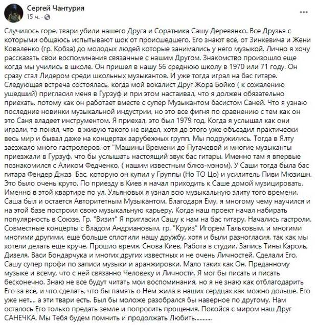 net. "Случилось горе. Твари убили нашего друга и соратника Сашу Деревянко. Все друзья, с которыми общаюсь испытывают шок от происшедшего. Его знают все, от Зинкевича и Жени Коваленко (группа Кобза) до молодых людей, которые занимались у него музыкой", - не может поверить в случившееся музыкант. По словам Чантурии, они с Александром познакомились в далеком 70-м году. "Саша был и остается авторитетным музыкантом. Благодаря ему, я многому чему научился и на этой базе построил свою музыкальную карьеру, - вспоминает Чантурия. - Когда наш проект начал набирать популярность в Союзе, группа "Визит", я пригласил Сашу к нам на бас-гитару. Начались гастроли. Совместные концерты с Владом Андриановым, группой "Круиз" Игорем Тальковым и многими многими другими... Прошло время. Снова Киев, Работа в студии. Запись Тины Кароль, Дизеля, Васи Бондарчука и многих других известных и не очень личностей. Сделали его, Сашу супер профи по записи музыки и аранжировки. Мало таких как он". Украинцы выразили свои соболезнования в комментариях: "Уроды несусветные!!!Высшую меру им за такое нужно!" "Мои соболезнования. Надеюсь, убийцам не избежать наказания, хотя это не вернет нам МУЗЫКАНТА..." "Я в диком ужасе от произошедшего. .. не могу понять за что его душе такие испытания. Светлая память" "Просто нет слов!!! Нет ни совести, ни сердца - нет уже в людях ничего! Кроме денег и власти! Царство небесное Гению!!!" Напомним, тело Александра со следами удушения обнаружили 4 декабря в гаражном кооперативе в Борисполе. До этого музыканта почти две недели разыскивали, как пропавшего. Полиция уже задержала двух подозреваемых в убийстве. Якобы молодые люди втерлись в доверие Деревянко под видом желания брать уроки игры на гитаре, а сами убили с намерением подделать документы на его квартиру. Напомним, неадекват с "розочкой" устроил переполох в столичной церкви, кадры: "Угрожал лишить жизни..." Как сообщала Politeka, оборвалась жизнь звезды "Голоса", на последних кадрах он успел сообщить главное: "Случайно ввел себе..." Также Politeka писала, что ушел из жизни музыкант культовой группы 90-х, его хиты знали наизусть