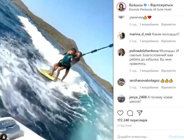 Стоит отметить, что периодически было слышно детский крик, но дети все равно выполнили трюк и поймали волну. «Приближаем выходные новыми трюками! Сплоченные, смелые, отважные, амбициозные! Горжусь моими героями. И вот так дружно держим курс в новую школу! Уже через пару дней будем знакомиться с новыми классами. Мы готовы! Греция, конечно, нас зарядила на все 100%», - сообщил гордый отец. За несколько часов его видео посмотрели более 170 тысяч раз. В комментариях деткам оставили массу приятных слов и комплиментов. «Какие они умнички!!! Мне даже страшно смотреть, не то чтобы попробовать повторить такое», «Герои», «Бесстрашные котятки», «Молодцы детки Ваши!», «Довольно смело», «Класс», «Какие смелые и дружные!», «Офигеть!», «Это просто круто молодцы!», «Какие они молодцы!», - пишут пользователи сети. Напомним, что Киркоров в одних плавках сверкнул подкачанной фигурой, Ивлеева оценила. Как сообщала Politeka, сияющий Киркоров зацеловал известную актрису, которая глумится над Бузовой: "Обожаю!". Также Politeka писала, что кучерявый Киркоров напомнил о себе задорными танцами с мулаткой: «Образ твой манит...».