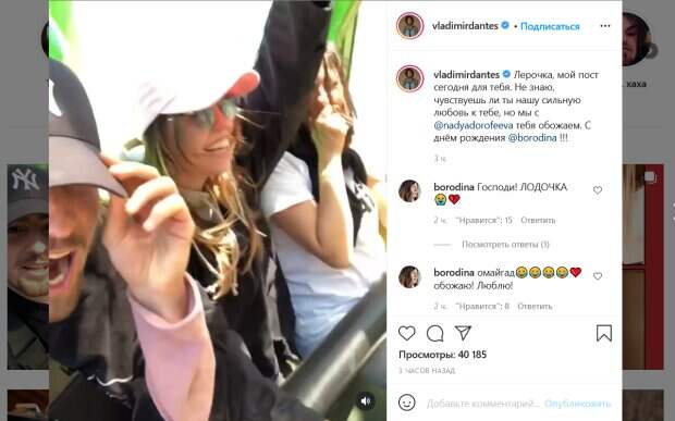 С днём рождения!», - написал певец. Он также поделился праздничным видео, на котором собрал самые веселые моменты их совместных развлечений. На кадрах Дантес, Дорофеева и Бородина беззаботно веселятся, катаются на разных аттракционах с громкими криками, путешествуют и смеются. Сама именинница отреагировала на пост словами: «Омайгад обожаю! Люблю!». Поклонники Дантеса также присоединились к поздравлениям. «Обожаю её юмор», «Так мило», «С Днём Рождением тебяяяя Лераааааа!», «Здорово», - пишут люди. Отметим, что на днях Дантес объявил о своем решении не выходить на улицу. Об этом Владимир рассказал в одном из последних сторис. Все дело в том, что блогер тесно общался с людьми, у которых выявили коронавирус. По словам певца, он занял себя просмотром шоу «Холостяк». Ситуацию усложнило то, что его жена, Надя Дорофеева улетела на съемки в другую страну, поэтому дома он сидел один. Напомним, замужней Дорофеевой публично признался в любви продюсер "Голосу країни": "Надя раскрылась совсем иначе". Как сообщала Politeka, томная Дорофеева с расставленными ножками назвала, что приносит ей удовольствие, Дантес засуетился: "Тоже обожаю...". Также Politeka писала, что одинокий муж Дорофеевой Дантес огорошил плохими новостями: "Тесно контактировал с. ..".