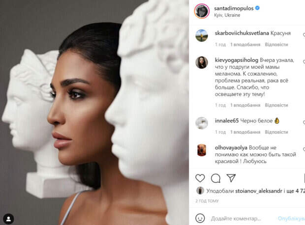 Артистка опубликовала свой портрет, показав идеальный греческий профиль. «Рада быть частью важного социального проекта «SkinScan. Я берегу свою кожу». Главная идея проекта (и выставки в TРЦ Dream Town), которую поддержали многие украинские звезды, – привлечь внимание к проблеме меланомы в Украине, которая растет и молодеет с каждым годом», - отметила звезда. В комментариях Санте оставили массу приятных отзывов и слов благодарности. «Очень Яркая и нереально красивая Санта. Любуюсь Вами», «Идеальный греческий профиль», «Красота», «Идеальна! Божественна!», «Вообще не понимаю, как можно быть такой красивой! Любуюсь», - пишут пользователи сети. Ранее мы писали, что Санта Димопулос поделилась кадрами с отдыха на Кипре. Певица выбрала для фото красивую локацию среди кустов цветущих роз. Звезда позировала в легком длинном платье, которое красиво легло по фигуре. Напомним, что звезда "Танців з зірками" Димопулос в одной блузе напросилась на комплименты, показав ножки: "Невероятная". Как сообщала Politeka, дочь победительницы "Танців з зірками" Димопулос растет голубоглазой красоткой, появилось фото: "Куколка". Также Politeka писала, что победительница "Танців з зірками" Димопулос стерла ноги в кровь: "Раны до сих пор. ..".