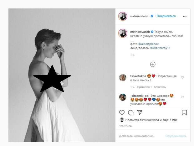 Об этом пишет Politeka.net со ссылкой на страничку знаменитости. "Такую мысль недавно умную прочитала... забыла!", - написала Дарья. Фанаты, включая Асмус, поставили более 7 тысяч лайков и написали комментарии: "Потрясающая и ты и мысль", "Это шедевр, ужажсно красиво", "Даша, вы красотка", "Как это женственно, нежная как лепесток цветка", "Все хорошее люди что-то забывают", "Как же я завидую твоему мужу", "девочка, похожая на мальчика.....а стоит одеться - и вновь, роскошная дама!". Сообщалось, что популярная российская актриса, звезда сериала «Папины дочки» Дарья Мельникова поделилась откровенным фото. На своей странице в Инстаграм красотка опубликовала серию фото, которые не вошли в итоговый набор фото для мужского журнала «MAXIM». На фото 28-летняя актриса, которая прославилась благодаря роли пацанки Женьки в молодежном сериале, показала себя в другом цвете, покорив сердца фанатов. Напомним, «Папины дочки» выросли и поразили новой внешностью, одна краше другой А еще Politeka сообщала, что звезда «Папиных дочек» разделась и показала стройную фигуру Также Politeka писала, что звезда «Папиных дочек» напугала внешним видом на отдыхе