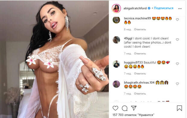 Чаще всего кружева не могут скрыть и сантиметра не ее теле. Именно поэтому фото Эби в Инстаграм бурно обсуждаются фолловерами. Так, Рэтчфорд делится фото не так часто, как другие модели, но постоянно впечатляет образами во время публикации новых кадров. Девушка не повторяет выбор наряда и стиля, но очень часто ей пишут, что она нарушает грани приличий. Как видно на фото, Эби попросту задрала лифчик с белыми кружевами и показала достоинства без малейшего смущения. Яркий макияж, множество массивных украшений и аксессуаров с камнями, а также акцент на бюсте произвели впечатление на поклонников: «Бог простит тебя!!