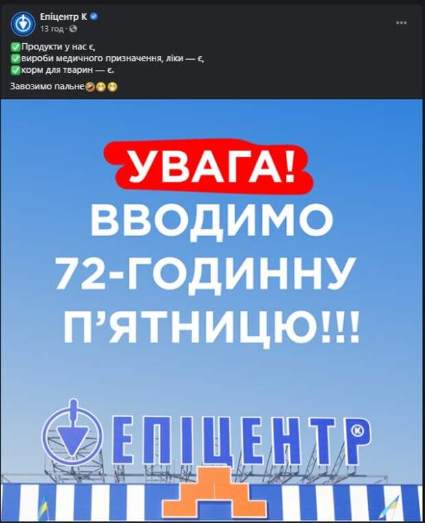 Сеть торговых центров "Епицентр" анонсировала 72-ух часовой рабочий день в пятницу Как передает Politeka.net, соответственное сообщение появилось на Facebook-страничке компании. Так, в субботу ТРЦ планируют открыть двери для своих посетителей в 8:00, в воскресенье – в 9:00. В выходные дни конец рабочего дня запланирован на 21:30.
