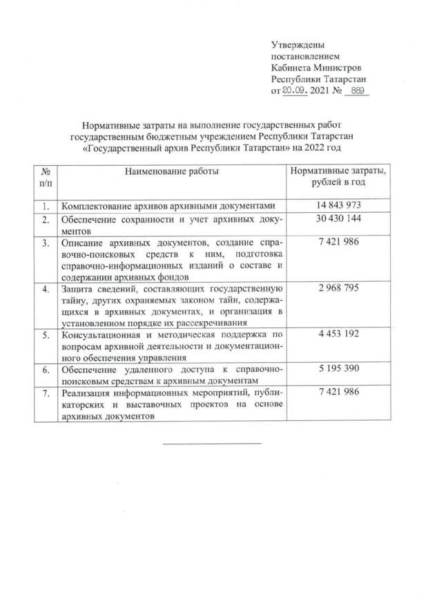 Кабмин Татарстана утвердил нормативные затраты Государственного архива РТ на 2022 год. Постановление опубликовано на портале правовой информации республики. На государственные работы Госархива РТ в следующем году предусмотрены следующие нормативные затраты: Обеспечение сохранности учет архивных документов — 30,43 млн рублей; Комплектование архивов архивным документами — более 14,8 млн рублей; Описание архивных документов, создание справочно-поисковых средств к ним, подготовка справочно-информационных изданий о составе и содержании архивных фондов — более 7,4 млн рублей; Проведение информационных мероприятий, публикаторных и выставочных проектов на основе архивных документов — 7,4 млн рублей; Обеспечение удаленного доступа к справочно-поисковым средствам и архивным документам — 5,2 млн рублей; Консультативная и методическая поддержка по вопросам архивной деятельности и документационного обеспечения управления — более 4,45 млн рублей; Защита сведений, относящихся к гостайне, и других охраняемых законом тайн, содержащихся в архивных документах, а также организация их рассекречивания — 2,9 млн рублей.