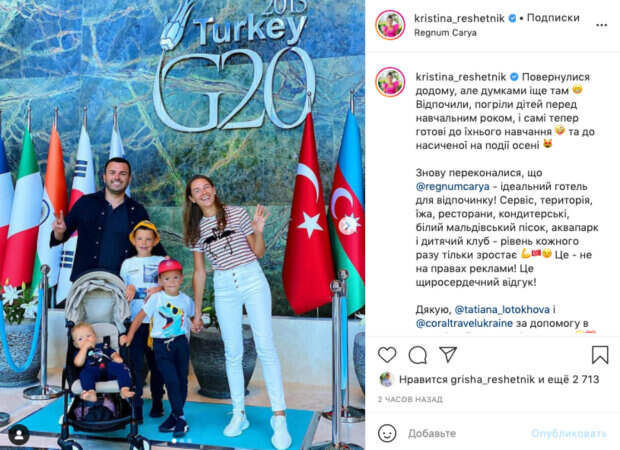 Кристина и Григорий активно ведут социальные сети и делятся с поклонниками моментами из жизни. На этот раз Кристина Решетник опубликовала новое фото. На снимке - вся семья: Григорий и Кристина, и их дети - Иван, Дмитрий и Александр. Как известно, семья только вернулась с отдыха. "Вернулись домой, но мыслями еще там