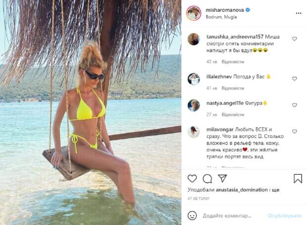 Как видно, Миша запечатлена в роскошной пляжной локации – она присела на качели под пальмой над водой. Перед камерой артистка позирует в ярком желтом бикини, которое только подчеркивает все ее прелести и ровный идеальный загар. Волосы красотки собраны в небрежный пучок на макушке, а на ее лице стильный солнцезащитные очки, она как будто задумалась о чем-то. В подписи к фотографии Романова написала: "Как растянуть удовольствие, если вы любите все и сразу?". Поклонники тут же принялись активно обсуждать новое пляжное фото певицы, засыпая ее комплиментами в комментариях. "С маслом сливочным", "Миша, смотри, опять комментарии напишут: я бы вдул", "Погода у Вас огонь", "Фигура роскошная", "Столько вложено в рельеф тела, кожу, очень красиво, эти жёлтые тряпки портят весь вид", "Красотка", "Какая красивая", "Шикарная", - пишут фанаты под фото. Напомним, Подруга Макса Барских Романова показала в мини-бикини свои самые аппетитные места: "Дива". Как сообщала Politeka, Подруга Макса Барских Романова в прозрачном платье-сеточке показала свои достоинства: «Мэрилин Монро 2021». Также Politeka писала, Подруга Макса Барских Романова с "подгулявшим" декольте поддержала пышные формы руками: фото.