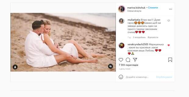Пара обручилась в Дубае, а свадебная церемония состоялась 2 сентября в роскошном ресторане в Одессе. О свадьбе Кищук рассказала в своем Instagram. Она написала, что это был самый счастливый день ее жизни и она невероятно счастлива. Также Кищук показала поклонникам нежное видео со своим мужем в стиле love stories. Ролик сняли на одном из пляжей у моря, Марина с Олегом показали настоящую любовь и нежность. Поклонникам понравилось видео, они написали много комментариев и пожелали Марине семейного счастья. "Поздровляю вас!!! Очень красиво
