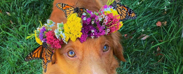 Знакомьтесь, это Майло - новошотландский ретривер из Калифорнии, который очень любит бабочек.А бабочки - его, так как Инстаграм собаки забит мимишными фото, где на ретривере восседают крылатые.Но бабочки - не дикие, пишет Bored Panda. Хозяйка Майло Дженнифер Беннет разводит в саду бабочек особого вида - данаида монарх.