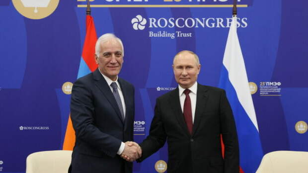 На полях Петербургского международного экономического форума (ПМЭФ) президент России Владимир Путин провел встречу со своим коллегой из Армении Ваагном Хачатуряном. Они обсудили развитие отношений двух стран, передает «МИР 24». «Армения – не просто наш партнер, а союзник стратегический. Мы ценим это, понимаем все, что происходит сегодня в Армении, вокруг Армении.