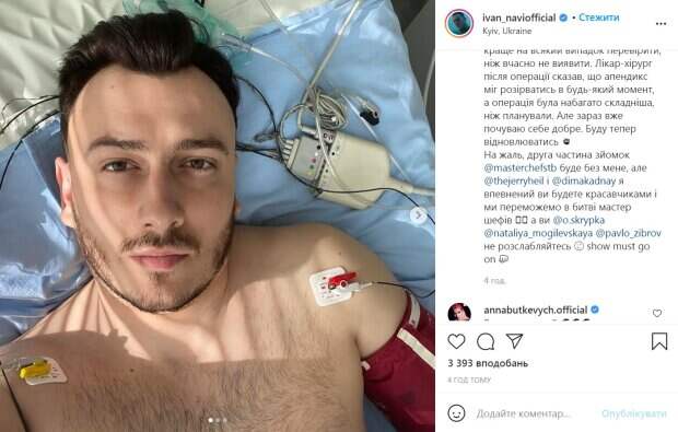ЧП произошло с певцом Иваном Нави во время съемок шоу " Мастер Шеф» Как передает Politeka.net, подробностями артист поделился на своей странице в Instagram. «Со съемочной площадки на операционный стол. Такого у меня еще не было. Сейчас в реанимационной палате отхожу от операции, которую ночью сделали в клинике института хирургии им.