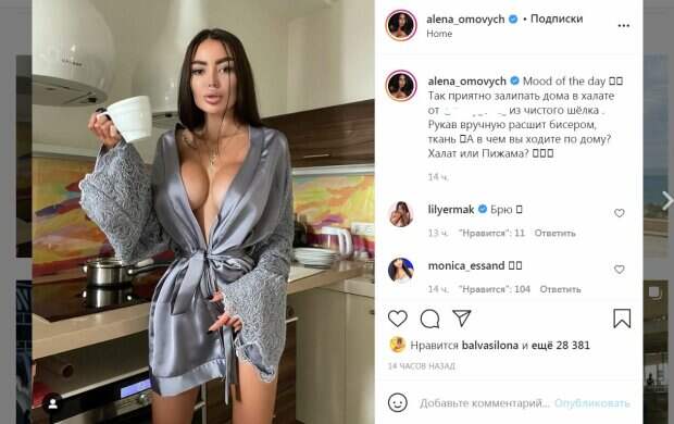 Известная модель Алена Омович, которую называют украинской Кардашьян, блеснула бюстом в халатике Звезда интернета прославилась благодаря тому, что сделала несколько операций и рассказала о них в подробностях, сообщает Politeka.net. Сейчас Алена дает полюбоваться своим шестым размером. В этот раз модель предстала в одном шелковом халатике, под которым не было белья.