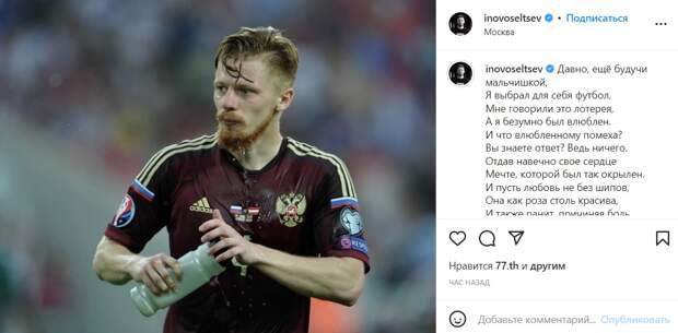 Бывший игрок сборной России по футболу, 31-летний Иван Новосельцев объявил о завершении карьеры. На своей странице в соцсети он опубликовал стихотворение, в котором признается в любви к футболу. Спортсмен также выразил благодарность своим болельщикам за поддержку и тех, кто помогал ему продвигаться по спортивной карьерной лестнице.