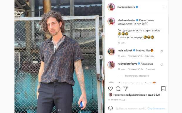 Украшение в виде крупной цепи на шее дополнило образ артиста. На первом снимке Дантес позирует, стоя у забора с приоткрытым ртом. А на втором фото артист шагает на фоне зелени. «Какая более сексуальная 1я или 2я?))) Сегодня делал фото в стрит стайле. Я голосую за первую», - написал Владимир. Его пост рассмешил Дорофееву, а также впечатлил Лесю Никитюк, которая написала в комментариях: «Мистер Лео» и поставила смайлик с огнем. Фанаты также оценили пост певца. «Что по тиграм?», «Какой мачо офигенный», «И там и там просто пушка», «первая, тут даже без аргументов», «Обкумареный ежик», - пишут люди. Напомним, Никитюк в латексе и экстра-мини заставила восторгаться Кухар, Дантеса и других звезд. Как сообщала Politeka, муж Дорофеевой Дантес разоткровенничался о семье, зацепив звездную супругу. Также Politeka писала, что муж Дорофеевой Дантес попал под удар стихии в Киеве, пугающие кадры.