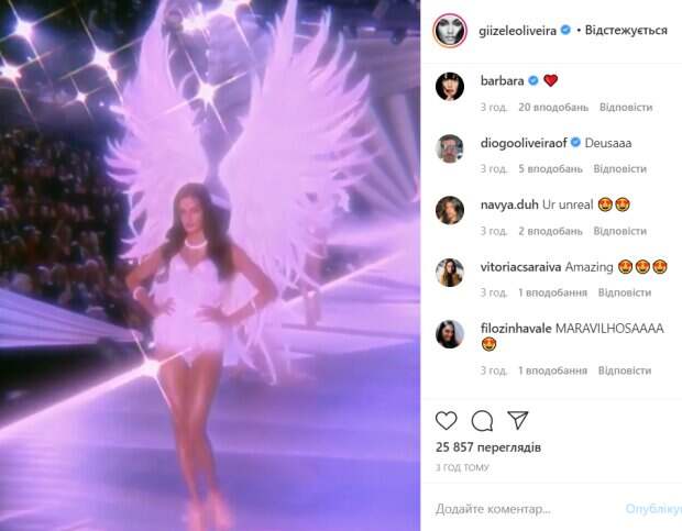 Также она выходила на подиум в игривой мини-юбке, бюстгальтере и кофточкой с вышивкой. За три часа пост модели посмотрели более 25 тысяч раз. В комментариях ей оставили массу комплиментов. «Богиня», «Нереально», «Удивительная», «Я вас всех люблю. Что касается вас, то и внутри, и фигура очень красивые», «Отлично», «Она ангел, красавица», «Я смотрел на всех и был очень счастлив, когда ты пришла», «Белые большие крылья... моя любимая», «Ты такая милая. Ты должна носить крылья», - пишут пользователи сети. Ранее мы писали, что Жизель Оливейра сразила «звериной» страстью на новых фото. Красотка надела платье с тигриным принтом. Она позировала возле стены, соблазнительно изогнувшись. Обтягивающий наряд выгодной подчеркнул красивую фигуру звезды. В комментариях ей оставили комплименты. «Ты услышишь мой рев», «Королева тигров», «Какая женщина, моя Бразилия», - пишут люди. Напомним, что Жизель Оливейра засветила самые вкусные места в топе без белья: "Вот шалунья". Как сообщала Politeka, Жизель Оливейра облачила сочные формы в тесный топ с цепями: «Светишься, как бриллиант!». Также Politeka писала, что Жизель Оливейра сняла даже белье и показала самое сокровенное на камеру: «Сенсационная красота».