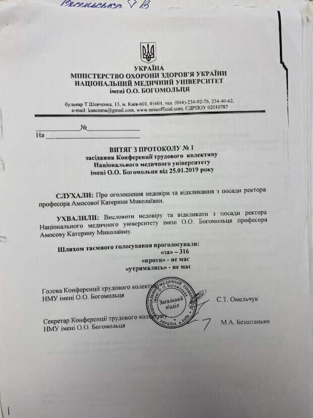 11.2019 № 757/54290/18-ц та зобов’язав поновити на посаді ректора Національного медичного університету, дочку відомого кардіохірурга, яку за ряд систематичних порушень звільнила тодішня очільниця Міністерства охорони здоров’я Уляна Супрун. Нагадаємо, що 4 рази Печерський районний суд столиці допомогав Катерині Амосовій поновитись на посаді ректора. Рішення судді Печерського суду, який і сам не раз притягувався до відповідальності за дисциплінарні проступки та підозрювався у корупції підтримував ще один одіозний суддя Євген Аблов з Окружного адміністративного суду. Причому, як перший так і наступні суди відмовлялись брати до уваги два рішення колективу Національного медичного університету ім. О.О. Богомольця про висловлення недовіри екс-ректорці. Зазначимо, що таке в історії України сталося вперше, коли колектив одноголосно постав проти керівника. Судячи з документів, про недовіру їй як ректору колектив проголосував одноголосно, тим самим не підтримуючи її присутність в Університеті та поновлення на посаді. Зазначимо, що в МОЗ України не раз коментували поновлення екс-ректорки, вказуючи суду на законність і обґрунтованість свого рішення. Негласно, джерела в МОЗ України повідомляють, що звільнення Амосової могло би відбутися набагато раніше, якби екс-міністр Сандро Квіташвілі не зважив на прохання дружини тодішнього президента Петра Порошенко та не заховав у довгу шухляду результати перевірки прокуратури, що вказували на страшенну корупцію у ВУЗі та розтрату державного майна. Один з таких актів, зокрема публікувало видання Аптека.ua. Однак, кримінальні справи по розтраті майна НМУ за часів пані Амосової чомусь й досі припадають пилом на полицях правоохоронних органів. Чим скінчиться запекла боротьба екс-ректорки за крісло і чи буде третя недовіра до неї з боку професорського складу колективу НМУ покаже час. Одне можна сказати напевно, спираючись на результати виборів ректора та рішення Вченої Ради щодо недовіри екс-ректорці – вони її не чекають і будуть відстоювати свій вибір.