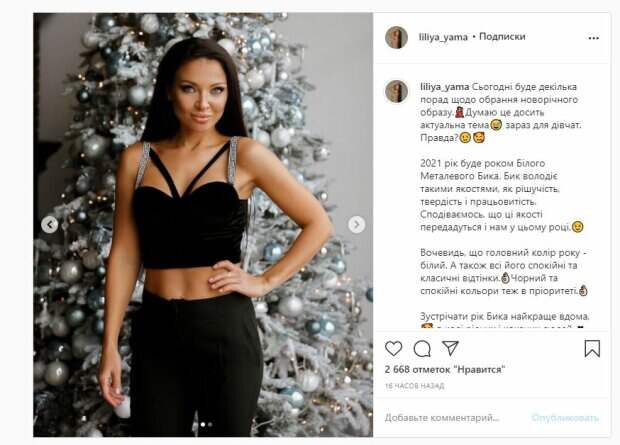 Жена украинского хореографа Влада Ямы Лилия показала себя в праздничном образе На фото Лилия позирует в черном топе. Образ красотка дополнила черными штанами, а рукой взялась за бедро. Волосы у Ямы были распущенными, а на лице легкий макияж. Звезда хвасталась фигурой, стоя у новогодней елки, и восхищала идеальными изгибами.
