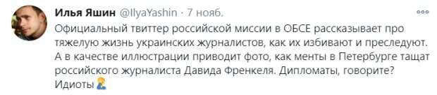 Российская миссия в ОБСЕ заявила про якобы "тяжелую жизнь" украинских журналистов и тут же опростоволосилась Так, официальный твиттер российской миссии в ОБСЕ заявил про тяжелую жизнь украинских журналистов, как их избивают и преследуют. В качестве иллюстрации опубликовали фото, как российский ОМОН в Петербурге тащит российского журналиста Давида Френкеля в автозак.