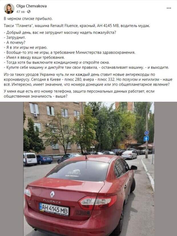 В Киеве водитель такси отказался надеть маску и высадил пассажирку, которая потребовала от него соблюдения требований Минздрава Этой пассажиркой оказалась первый замглавы Комитета по вопросам свободы слова и информационной политики, нардеп Ольга Червакова, рассказавшая о сложившейся ситуации на своей страничке в соцсетях.
