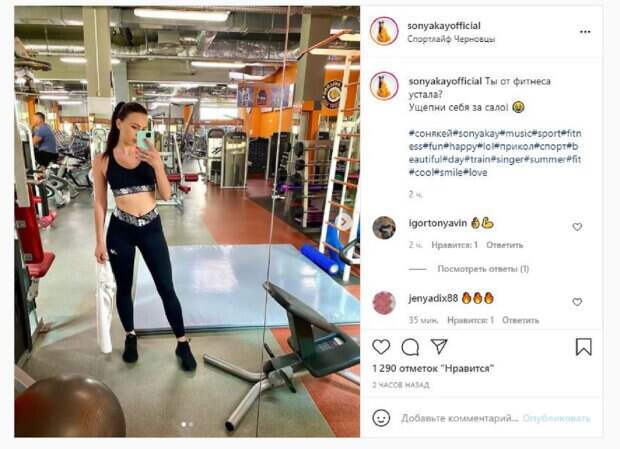 В этот раз Соня опубликовала фото, на котором позировала в топе штанах. Девушка стояла перед зеркалом, хвастаясь идеальной фигурой. Как можно понять, красотка занималась в спортзале и решила похвастаться своими достижениями. "Ты от фитнеса устала? Ущипни себя за сало!", - написала Соня. Фанаты поставили более тысячи лайков и написали комплименты: "Наша спортивная красотка", "Сонечка ты шикарная моя девчонка. Сонечка ты умничка, так держать", "Соня ты красава,у тебя не капли сала", "У меня фитнес - это море". Напомним, племянница Софии Ротару выбрала смелый образ с коротким топом для похода в кафе А еще Politeka сообщала, что племянница Ротару с вырезами на бедрах поразила видом в спальне Также Politeka писала, что племянница Ротару, выпятив пятую точку, мастерски оседлала надувной круг