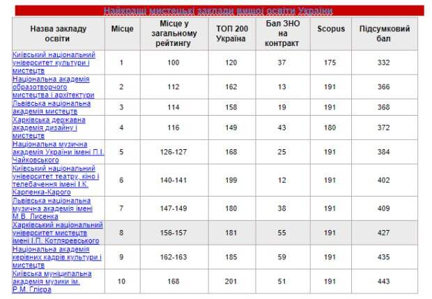 Информационный ресурс «Освіта.ua» представил вузы культуры и искусств, которые заняли высокие места в консолидированном рейтинге высших учебных заведений Украины 2021 года Киевский национальный университет культуры и искусств занял лидирующую позицию - первое место в Топ-10 рейтинга « Лучшие высшие учебные заведения культуры и искусств Украины» Рейтинги, использовавшиеся при составлении консолидированного рейтинга вузов Украины: «ТОП-200 Украина» — базовым принципом ранжирования университетов в рейтинге является обеспечение полной открытости, прозрачности и независимости ранжирования университетов.
