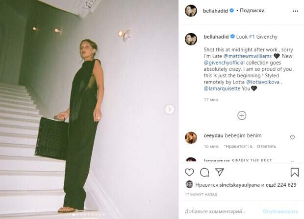 Фотографии знаменитость разместила на своей странице в Инстаграм, передает Politeka.net Так, Белла Хадид позировала на лестнице у себя дома в интересной блузке, которая под низом оказалась полностью прозрачной, засветив при этом небольшую, но упругую грудь. Также на ней были одеты широкие брюки. Модель эффектно показала свою стройную фигуру, подтянутый живот и длинные ножки, а стильный образ дополнила массивной сумкой бренда Givenchy. «Новая коллекция @givenchyofficial просто безумна. Я так горжусь тобой, это только начало! », - написала Хадид. Мы также писали, что любительница бургеров и вкусного фаст-фуда в целом не стесняется показывать свою фигуру. Супермодель может не только похвастаться томными изгибами в нужном свете, но и показать, что выглядит достаточно стройно и даже идеально для девушки, участвующей в топовых мировых показах. При своей любви к вредной пищи девушка также сильно любит спорт, поэтому сжигает все калории с легкостью. Напомним, что знойная Белла Хадид засветила самые аппетитные места в дерзком наряде А еще Politeka писала, что жаркая Белла Хадид сверкнула округлостями в неприличном купальнике Также Politeka сообщала, что мокрая Белла Хадид пошалила на камеру, горячие кадры