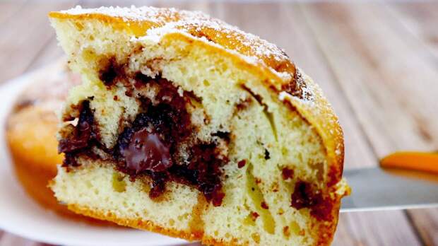 Подготовьте форму: смажьте ее сливочным маслом и присыпьте мукой. Распределите тесто, на него хаотично выложите нутеллу ложкой. Деревянной шпажкой или просто ручкой ложки сделайте круговые движения, чтобы нутелла немного объединилась с тестом. Выпекать пирог в духовке 30 минут при 180 °C. Домашняя выпечка с нутеллой