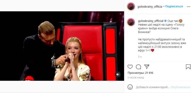 Так, одна из участниц в следующем эфире "Голосу країни" окажется девушкой, в которой Винник узнает свою "бывшую возлюбленную". Судя по отрывкам, артист выбежит к ней на сцену и приведет за судейское кресло, усадив к себе на колени. Также показан трогательной момент, как Винник вытирал слезы на лице девушки. "Боже, Никита, извини", - обратилась она, скорее всего, к своему нынешнему возлюбленному. "Никита, не ревнуй, береги это сердце...", - добавил Винник, продолжая обнимать симпатичную блондинку. "Я тебя буду ждать", - сказал артист ей на прощание. После этого зрителям показали, как Винник сидит в замешательстве у основания сцены и, видимо, с трудом приходит в себя после этой неожиданной встречи. "Слушайте, почему так тяжко? Не, ну, правда, я держался, как мог", - обратился Олег к своим коллегам-тренерам, которых также очень удивило случившееся. Пользователи кинулись с жаром обсуждать увиденное. Многие отметили, что подобные ситуации с внезапным появлением "бывших" уже не новинка, такое и раньше бывало в предыдщих сезонах. "Голос превратился в дом два