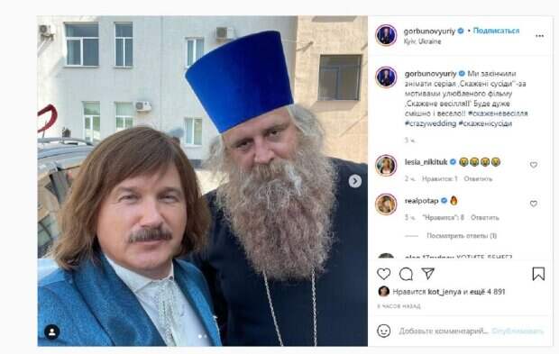 На фото Юрий и Алексей снова были в своих образах. "Мы закончили снимать сериал, Бешеные соседи '- по мотивам любимого фильма, Безумная свадьба !! "Будет очень смешно и весело!", - написал Горбунов. Леся Никитюк и Потапенко оценили публикацию Горбунова. Фанаты поставили более 4 тысяч лайков и написали комментарии: "переженили всех, теперь батюшка, пусть крестит, мальчики огонь", "После причастия", "Супер, люблю смотреть комедии и смеяться. Насмеялась с мужем до троих детей", "Думаю, это будет очень интересно", "Поздравляю, будем ждать в кинотеатрах". Напомним, Горбунов, рассекретивший имя младшего сына, оказался за решеткой ради Оскара А еще Politeka писала, что Осадчая обнажилась на последнем месяце беременности, закулисье скандальной съемки Также Politeka сообщала, что Горбунов заставил украинцев грустить, показав закулисье новых "Танців з зірками"
