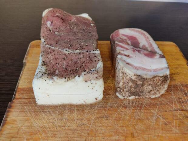 Попробуйте определить, какой кусочек сала был куплен в «Магните», а какой привезен из деревни. Скорее всего, вы угадали. Сало с левой стороны нам передали родственники, которые живут в деревне под Саратовом и держат свою скотину. А кусок с правой стороны, я купил в ближайшем «Магните». Деревенские бабушки готовят сало по простому рецепту.