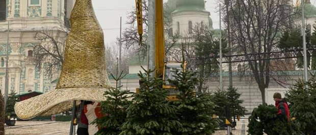 Главная новогодняя елка украинской столицы едва не стала жертвой декоммунизации – вместо традиционной звезды ее украсили огромной шляпой. Изначально на елку, которую установили на Софийской площади, повесили 58-килограммовое изделие из гирлянд в виде шляпы.