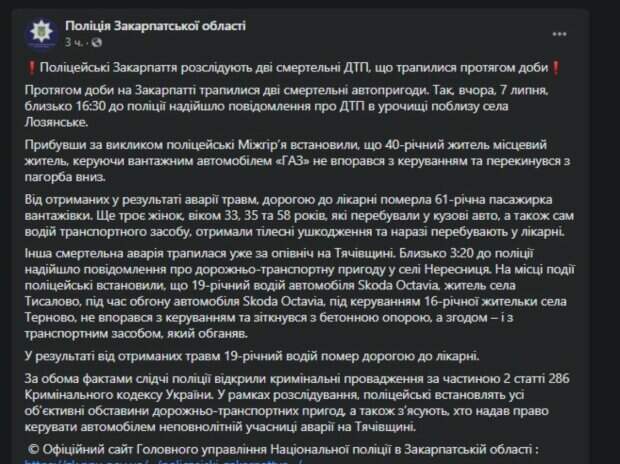 На Закарпатье произошло ДТП с летальным исходом Как передает Politeka.net, подробности сообщили в пресс-службе полиции области в Facebook. Инцидент произошел 7 июля - водитель "Газона" не справился с управлением и слетел с холма. "От полученных в результате аварии травм по дороге в больницу скончалась 61-летняя пассажирка грузовика", - говорится в сообщении.