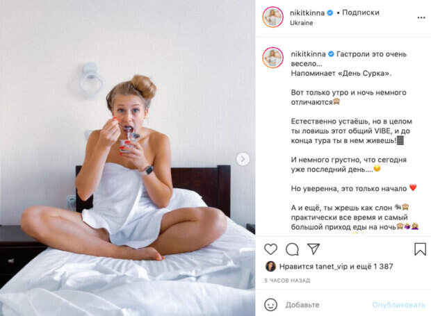Помимо работы в "Женском квартале" Екатерина занимается спортом, и обучает этому других. Девушка активно ведет социальные сети и делится с поклонниками моментами из жизни. На этот раз актриса поделилась новыми фотографиями на своей странице в Инстаграм. На снимках Екатерина, прикрившись одним белым полотецем, показала как ест йогурт в домашнем образе. "Гастроли это очень весело… Напоминает "День Сурка". Вот только утро и ночь немного отличаются Естественно устаёшь, но в целом ты ловишь этот общий VIBE, и до конца тура ты в нем живешь! И немного грустно, что сегодня уже последний день... Но уверенна, это только начало. А и ещё, ты жрешь как слон. Практически все время и самый большой приход еды на ночь. После концерта", поделилась актриса. Пользователи сети прокомментировали публикацию Екатерины: "Катюха хватит жрать , на голове уже горб вырос !", "Нахомячилась так , что кроме простыни ни во что не влезла.", "Хомячок". Ранее сообщалось, блондинка из "Женского квартала" устроила парад купальников, засветив фигуру: "Яркая и лучистая" Также, блондинка из "Женского квартала" засветила развлечения со звездной подружкой: "Ты мое сумасшествие" Politeka рассказывала, блондинка из "Женского квартала" засветилась на ночной вечеринке в Киеве: "Никитину понесло"