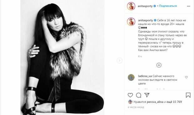 "Себя в 16 лет пока не нашла, но что-то вроде 20+ нашла. Однажды моя стилист сказала, что блондинкой я стану только через ее труп, пошла к другому и перекрасилась. Теперь прошу в тёмный - снова ни за что. Как вам Анитка вамп?", - подписала Анита Луценко подборку архивных снимков в своем микроблоге. Пользователям понравилось "перевоплощение" в брюнетку от тренера шоу "Зважені та щасливі", поэтому они ее засыпали восторженными комментариями. Но были и такие фанаты, которые призвали Аниту оставаться блондинкой, поскольку темный цвет ее якобы старит. "А мне Вы очень нравитесь в сегодняшнем амплуа - светленькая", "Сейчас намного моложе выглядите в светлом цвете", "Анита-вамп, мягко говоря, необычно) Блондинка с каре однозначно лучше", "Девушка, вам все к лицу", "А мне и брюнеткой нравится, такая страстная", "Вот это да...", "Просто улёт!", "Я подумала что это Джей Ло. Если б не прочла пост то так бы и думала дальше", - написали они под архивными кадрами звезды. Напомним, роскошная тренер "Зважені та щасливі" Анита Луценко разделась перед камерой А еще Politeka писала, что тренер "Зважені та щасливі" Анита Луценко восхитила фигурой в купальнике Также Politeka сообщала, что тренер "Зважені та щасливі" Анита Луценко раскрыла секрет плоского животика