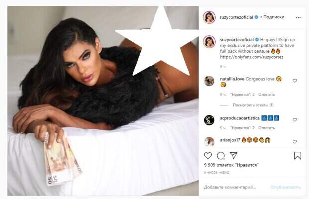 Известная модель Сьюзи Кортес, которая получила титул за самые красивые ягодицы, показала себя в необычном образе На фото Сьюзи показалась в черных кружевных стрингах и черной накидке. Кортес волосы оставила распущенными, а сама соблазнительно выгнулась, демонстрируя идеальный "орешек". Звезда лежала на белых простынях кровати, а в руках держала деньги.