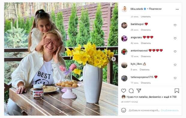 В этот раз Лилия опубликовала фото, показав, как проводит время на даче с дочерью. Ребрик сидела за столом, пока дочь Диана стояла сзади и закрывала маме глазки. Красотки смеялись, а на втором фото еще и обнимались. "Я часто задумываюсь, с чего начинается любовь мамы! С мелочей! # Счастье в моменте. Она проявляет себя в таких деталях, как вкусненько испеченных блинах на завтрак, в теплом какао в любимых чашках, в заботе любой момент, в мыслях о своих детях каждую секунду", - написала Лилия Ребрик. Фанаты поставили почти 5 тысяч лайков и написали комментарии: "Вы мама просто супер", "Диана красавица", "Очень люблю заварные блины, мои друзья и близкие всегда просят их на любой праздник", "Красотки мама и дочка", "Счастливая". Сообщалось, что известная украинская ведущая Лилия Ребрик поделилась секретом создания чуда для своей дочки на карантине. 30 апреля одной из дочерей ведущей исполнилось три года. Лилия и ее муж Андрей Дикий решили побаловать свою малышку, устроив для нее сказочный праздник. Напомним, Лилия Ребрик показала, как готовится к лету с подружкой А еще Politeka писала, что Лилия Ребрик похвасталась перед украинцами новым домом для трехлетней дочери Также Politeka сообщала, что Лилия Ребрик показала, как развлекается с мужем в загородном особняке