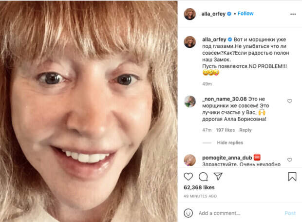 На этот раз Алла Пугачева поделилась новой фотографией на своей странице в Инстаграм. На снимке артистка улыбается и показывает себя без макияжа. "Вот и морщинки уже под глазами. Не улыбаться что ли совсем?Как?Если радостью полон наш Замок.Пусть появляются. NO PROBLEM!!!" Поклонники завалили певицу комлиментами и отметили, как она чудесно выглядит для своего возраста: "Это не морщинки же совсем! Это лучики счастья у Вас,