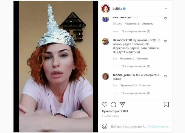 (Чтобы посмотреть, доскролльте до конца страницы) "Меня больше всего удивляют люди, которые пишут, что я сошла с ума, что я буду получать сигналы из космоса, и что за мной теперь будут следить... В общем, какое-то мракобесие", - произнесла Булитко, появившись в шапочке из фольги. Потом звезда подняла глаза к потолку и произнесла: "Есть контакт". Позже артистка сделала вид, что веселится с рептилоидом и поет с ним песни. "Земляне, передаю сообщение из космоса - нам хана!", - смеясь, сказала артистка. "7-ой день после #вакцины
