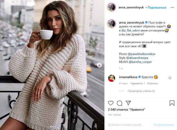 ». В салоне меня отговорили, а вы как думаете?», - написала Заворотнюк. Свой пост она сопроводила собственным фото в цветном и черно-белом варианте. На снимке Анна позирует на балконе с чашкой кофе в руках. Она небрежно облокотилась на ограждение, глядя в камеру. При этом из одежды на ней только свободный свитер крупной вязки. Под него девушка не надела даже штанов. Поклонники красотки тут же принялись обсуждать ее новый пост. «Красота», «Длинныеее. А как же различные причёски/ укладки? С каре не так много вариантов», «Мама копия здесь», «Аня, мне кажется, у Вас сейчас просто идеальная длина», «Не надо ты и так красотка просто бомба», - пишут люди. До этого мы сообщали, что 24-летняя Анна продемонстрировала упругие формы в дерзком наряде. Девушка опубликовала новые фото в своем микроблоге в Инстаграм, на которых предстала в коротенькой джинсовой юбке, белой маечке, розовой рубашке и стильной кепке. Также на ней были серые шлепки бренда Balenciaga. Анна позировала возле металлической беседки среди деревьев, на заднем плане виднелась вода. Напомним, Заворотнюк в мини-юбке и тесной маечке выбралась на природу: "Зачем надевать такие...". Как сообщала Politeka, печальная дочь Заворотнюк облачилась во все черное и потрясла признанием: "Время подводить итоги". Также Politeka писала, что Заворотнюк в платье со смелым декольте потрясла видом, выйдя на балкон.