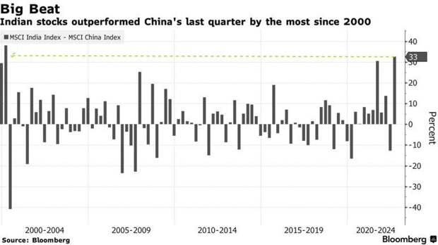 Падение рынка акций Китая на 5 триллионов долларов заставляет инвесторов обратить внимание на рынок акций Индии. MSCI India опередила MSCI China с наибольшим показателем с 2000 года в прошлом квартале. Расхождения проявляются и в позиционировании инвесторов, и в цепочках поставок. Авторы статьи: Абхишек Вишной (Abhishek Vishnoi) и Шихар Балвани (Shikhar Balwani) Непрекращающееся падение акций Китая повысило привлекательность их крупнейшего конкурента из числа развивающихся рынков Индии, спровоцировав расхождение, которое раньше редко наблюдалось.
