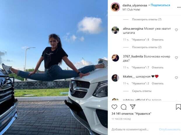 Именно поэтому своеобразной фишкой спортсменки стали фото в Инстаграм с демонстрацией шпагата. Даша уже отличалась растяжкой, показывая ту на скамейке, у стены, у бассейна или на яхте. Также Ульянова продемонстрировала воздушный шпагат у фонтана и на природе. Именно поэтому Дашу называют второй Волочковой, которая получила скандальную славу за неуместные выходки в публичных местах. Ульянова же на новом фото в стиле Жана-Клода Ван Дамма растянулась в шпагате на машине и снова дерзко напомнила о себе: «Это фото заслуживает ленты второй раз