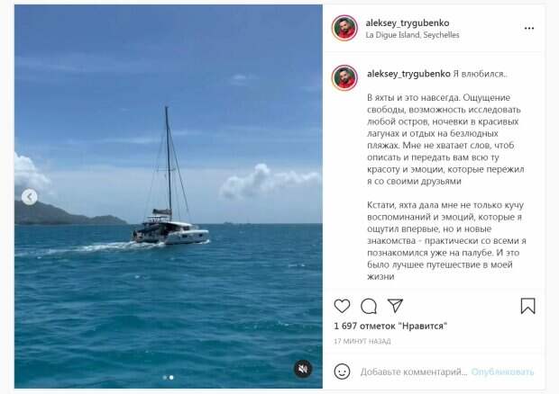 После провала на "Холостячке" бизнесмен продолжил работать, а также вести свой Инстаграм. Сейчас на страницу Алексея в Инстаграм подписана 171 тысяча человек, с которыми он делится разными постами, в том числе и затрагивает личные темы. В этот раз Тригубенко рассказал, что у него вспыхнули новые чувства. На фото бизнесмен светился от счастья, позируя в белых футболке и штанах. "Я влюбился... В яхты и это навсегда. Ощущение свободы, возможность исследовать любой остров, ночевки в красивых лагунах и отдых на безлюдных пляжах. Мне не хватает слов, чтоб описать и передать вам всю ту красоту и эмоции, которые пережил я со своими друзьями", - написал бизнесмен. По словам Алексея, яхта подарила ему массу эмоций, воспоминаний и новые знакомства. "В этом путешествии я понял, что круто путешествовать с компанией. Ведь это меня вдохновляет. Вдохновляют новые знакомства, новые места, новая и вкусная еда - после этого хочется творить и создавать", - поделился Тригубенко. Напомним, что экс-фаворит Мишиной Тригубенко прямо в машине разоткровенничался о своей любви Как сообщала Politeka, счастливая "Холостячка" Мишина не сдержала чувств рядом с возлюбленным Также Politeka писала, что фаворит «Холостячки» Ксении Мишиной устроил вечер страсти перед финалом