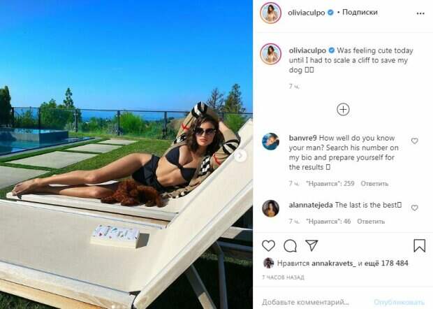 Модель расслабилась на шезлонге, вытянувшись под лучами солнца. Звезда едва не выронила грудь, которая сжалась, когда она подняла руку над головой. Тонкая талия, стальной пресс, идеальный бюст - в этом теле все идеально. Завершили образ клетчатая кофта и очки. Знаменитость лежала на шезлонге не одна, а вместе с собачкой. Однако на других фото модель уже держала своего питомца в руках, который попал в беду, но модель его спасла. "Сегодня чувствовала себя чудесно, пока мне не пришлось взбираться на утес, чтобы спасти свою собаку