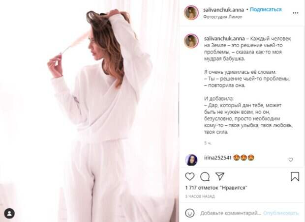 Болезнь стала для нее толчком переосмыслить жизненные приоритеты. Саливанчук сделала новый пост в своем микроблоге в Инстаграм, опубликовав атмосферное фото, на котором предстала во всем белом с легким перышком в руке, передает Politeka.net. В подписи жена продюсера вспомнила о совете, который ей когда-то дала бабушка. "– Каждый человек на Земле – это решение чьей-то проблемы, – сказала как-то моя мудрая бабушка. ⠀ Я очень удивилась её словам. – Ты – решение чьей-то проблемы, – повторила она. ⠀ И добавила: – Дар, который дан тебе, может быть не нужен всем, но он, безусловно, просто необходим кому-то – твоя улыбка, твоя любовь, твоя сила" Пользователи согласились с утверждением Саливанчук: "Это реально так❤️" "Какие сильные слова!!!!