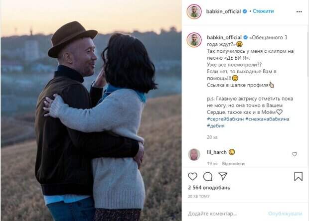 Популярный украинский исполнитель Сергей Бабкин поразил чувственным клипом на один из своих хитов Нс воей старнице в социальной сети Инстаграм артист опубликова стоп-кадр из клипа на песню «Де би я», на котором он стоит в обнимку со своей женой Снежаной, передает Politeka.net. «Обещанного 3 года ждут?