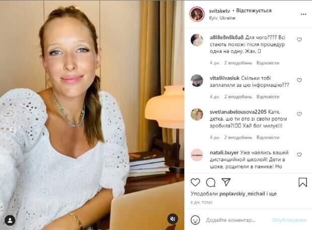 На странице ее шоу в соцсети Instagram появилось видеообращение, в котором Катю просто не узнали. В ролике телеведущая рассказывает о дистанционном обучении и рекламирует специальную онлайн-школу. Говорит это Катя в своем фирменном стиле, который, как и внешность не очень-то понравился украинцам. В комментариях телезвезду раскритиковали и за ее поддержку дистанционного обучения, и за внешность, и за манеру говорить. "Перекаченные губы мешают ей разговаривать, это очень заметно и некрасиво", "Ужас, а не губы", "Трудно смотреть на мимику. Всё лицо напряжено", "Что с Катей?", "Катя, вам совершенно не подходят те утиные губы. Имели нормальные губы, а теперь как все", "Капец, ну зачем так издеваться над собой?", "Как неестественно и не красиво", "Зачем накачали губы? Вы и так красивая, а стали как все", "Что с губами?", "Катюша, а Вам действительно нравятся такие губы?", - пишут пользователи в комментариях к видео. Напомним, Изящная Осадчая засветилась в объятиях мускулистого Олега Винника, фанаты оценили: "Классно смотрятся". Как сообщала Politeka, Осадчая с сожалением заговорила об уходящем лете: "Я не успела...". Также Politeka писала, что Осадчая похвалилась сыном от первого брака, который уехал из Украины: "Моя гордость".