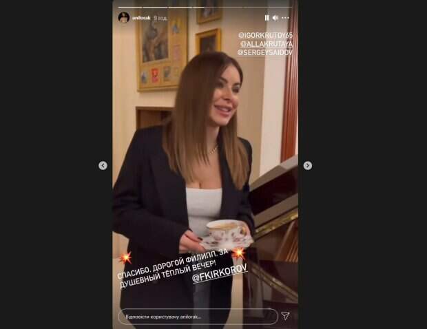 Ярким акцентом образа стала массивная золотая цепь на шее. На кадрах запечатлено, как Каролина (настоящее имя певицы) поет знаменитую украинскую «Пісню про рушник» авторства Андрея Малышко под аккомпанемент композитора и музыканта Игоря Крутого. «Спасибо, дорогой Филипп за теплый душевный вечер», - написала певица. Среди гостей, судя по отметкам, которые сделала Лорак, также была сестра Игоря Крутого, телеведущая Алла Крутая и продакшн-менеджер Сергей Саидов. Филипп Киркоров и Ани Лорак познакомились в 2001 году на съемках мюзикла «Вечера на хуторе близ Диканьки». Уже много лет они тесно общаются. Кроме того, Король российской эстрады является крестным дочери Каролины Софии. Артисты часто появляются вместе на светских мероприятиях и различных вечеринках. Недавно их засняли вдвоем на премии «Прорыв Года BEST-2021». Отметим, что личная жизнь Ани Лорак в последнее время вызывает большой интерес у ее поклонников. Они заметили, что на безымянном пальце у певицы появилось кольцо, похожее на обручальное. Сама артистка недавно призналась, что у нее в животе «присутствуют» бабочки, чем только подогрела слухи о своей грядущей свадьбе. Напомним, 42-летняя Ани Лорак впечатлила дерзким образом в красном: "Что же мучаете нас? ". Как сообщала Politeka, 42-летняя Ани Лорак счастлива и больше не одинока, фото нежностей: "Мой защитник". Также Politeka писала, Любовница экс-мужа Ани Лорак пококетничала перед камерой в костюме зайки: Мурат не смог устоять.