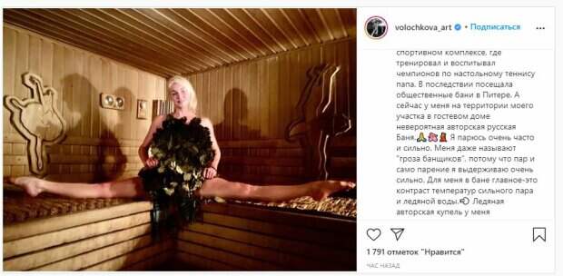 Известная балерина Анастасия Волочкова показала себя и рассказала о своей любви На фото звезда была в бане, демонстрируя эффектный шпагат. Как можно понять, Анастасия показалась в собственной парильне, ведь на фоне можно увидеть деревянные фигурки балерины. Волочкова была совсем без одежды и прикрывалась только веником.