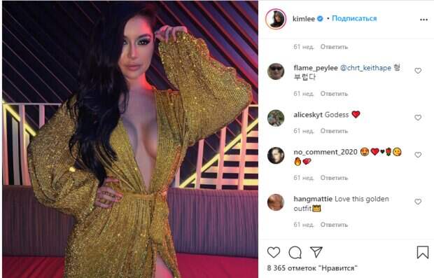 Как правило, она снимается для модных мужских журналов, показывает в Инстаграм фото из отдыха и удивляет личными селфи без постановок. В этот раз на фото можно увидеть довольно смелый образ Ли, в котором она отправилась отдыхать в клуб. Девушка не только распахнула золотистое мини-платье, больше напоминающее халат, но еще и посветила при этом бюстом без белья. Ким не стала прятать лишение, соблазнительно покрутившись перед объективом и заняв удобную позу для фото: «Красиво и открыто ❤️